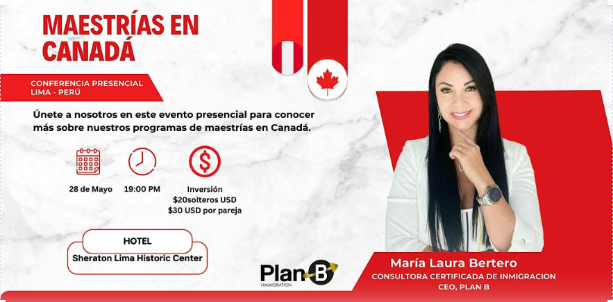 ¿Te gustaría estudiar una maestría en Canadá? ¡Entonces esta oportunidad es para ti! Plan B Immigration, destacado asociado a la Cámara de Comercio de Lima, organizará una conferencia presencial el martes 28 de mayo en el Hotel Sheraton de Lima. Este evento tan esperado se llevará a cabo de 7:00 p.m. a 9:30 p.m.